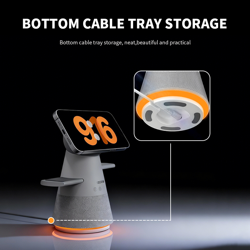 The R10 5-in-1 Rotary Touch Wireless Charger with Bluetooth Speaker and Clock combines multifunctional convenience with efficient wireless charging. Designed for modern desks and bedside setups, it supports simultaneous charging for smartphones, Apple Watch, and AirPods while also functioning as a Bluetooth speaker and digital clock display. With a maximum charging power of 25W, the R10 delivers stable, low-temperature fast charging supported by enhanced heat dissipation.