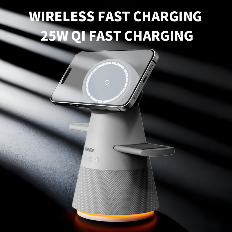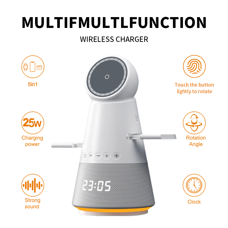 The R10 5-in-1 rotary touch wireless charger combines 25W fast charging with a Bluetooth speaker and digital clock. Compatible with iPhone 12–17, Android devices, Apple Watch, and AirPods, it features strong cooling, iOS 18 standby support, and a stylish Apple-white ABS+PC design.